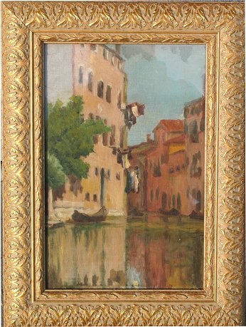 VENETIAN CANAL PAINTING: O/B, 11 1/2'' x 8'', unsigned, newer gilded frame, 15'' x 12'', Emilio Aickelin label verso.