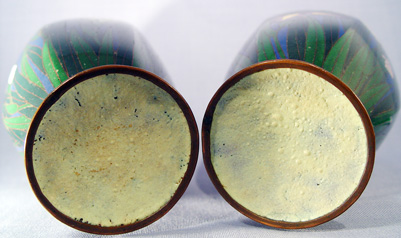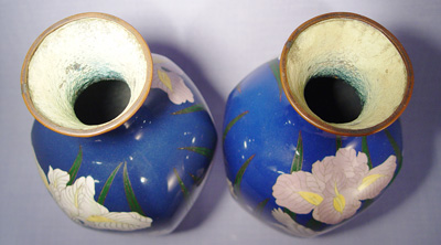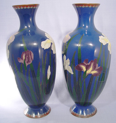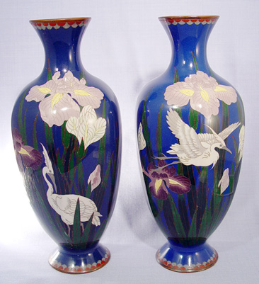 PAIR OF IRIS AND CRANE CLOISONNE VASES: Deep blue ground wit purple iris flowers and white cranes. 12''h.