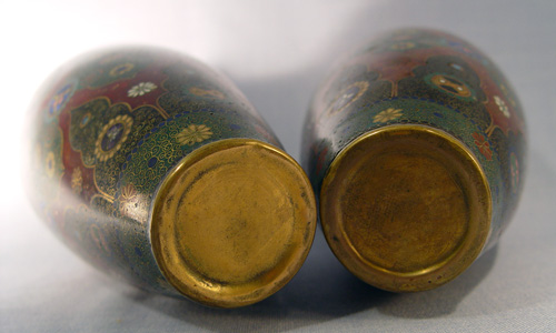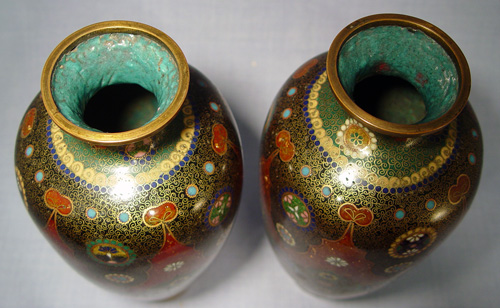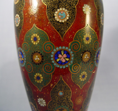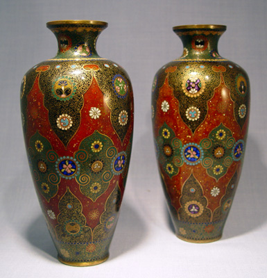 PAIR OF GOLDSTONE CLOISONNE VASES: Rich cobalt medallions circle a Persian design, slight imperfection to one. 8 1/2''h.