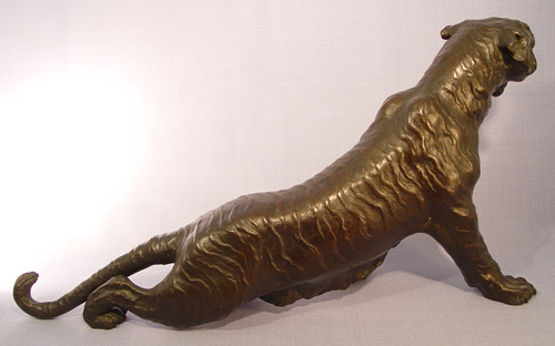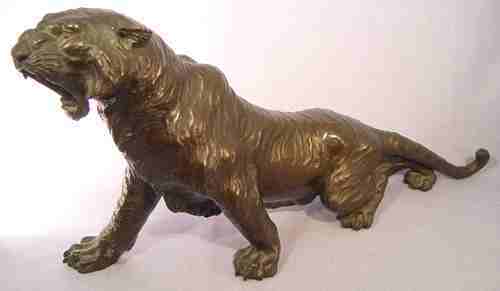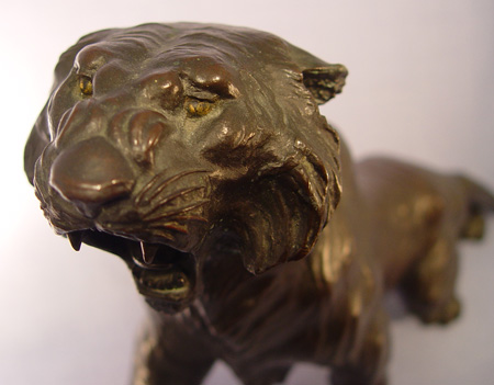 SIGNED JAPANESE BRONZE TIGER: Roaring tiger with raised stripes and ruff, gold tone eyes with pupils, signature to bottom of left rear foot. Approx. 21 1/2''l. x 10''h., 14 lbs.