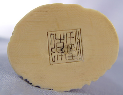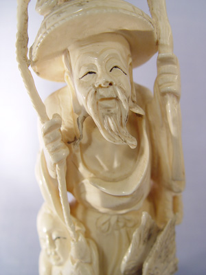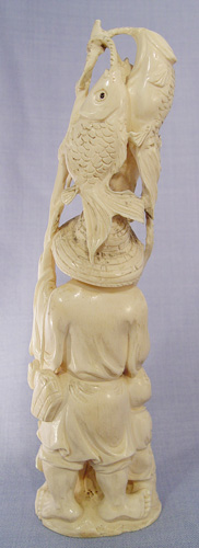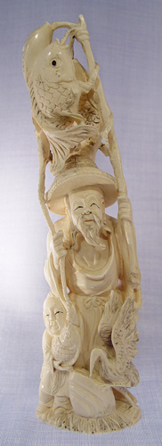 CARVED IVORY FISHERMAN WITH HERON & CHILD: Signed on the underside, 10''