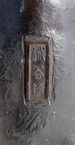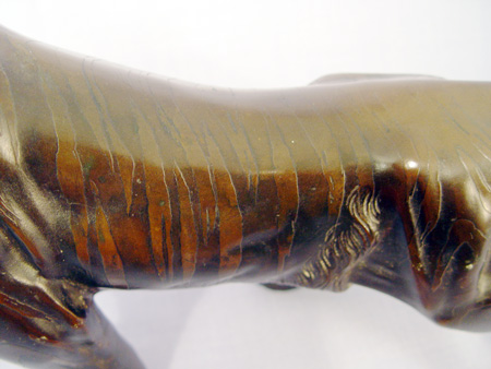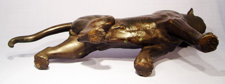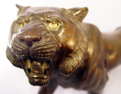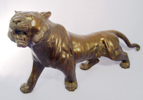 SIGNED JAPANESE BRONZE TIGER: Roaring tiger with tonal raised stripes incised pads on feet and glass eyes, signed on abdominal area possibly Seiya Saku?, nice patina, approx. 18''l x 9 1/4''h., 8 lbs.
