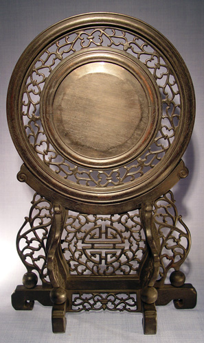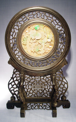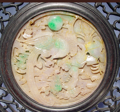 EARLY 20TH C CARVED JADE PLAQUE: Mounted in an intricately pierce carved wood frame and stand. The jade is 5'' dia. Stand is 17''h., 11''w., 5 1/2'' deep overall. Please note loss of one carved ball at the base.