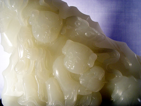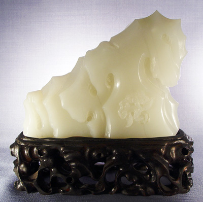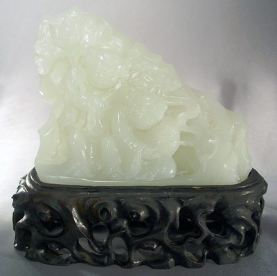 NORTHERN CHINESE CARVED WHITE JADE FIGURAL GROUP: Two figures in the foreground. The jade is 4 1/2''h. x 5 1/2''l. x 1 1/2'' overall. The carved wood stand is an additional 2''h.