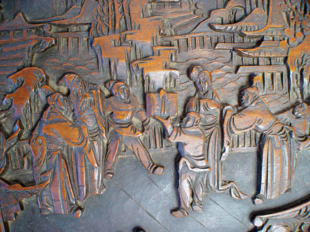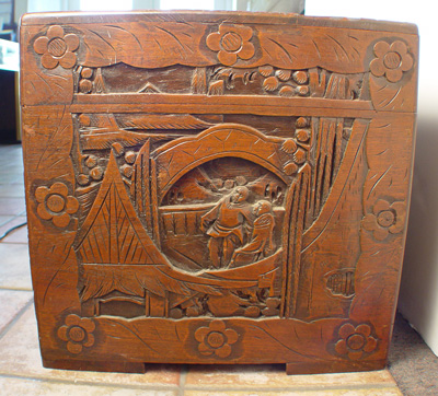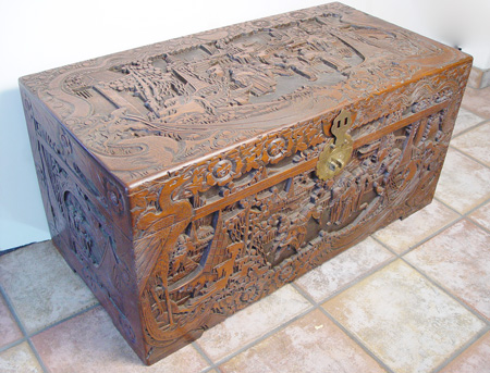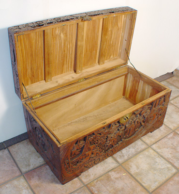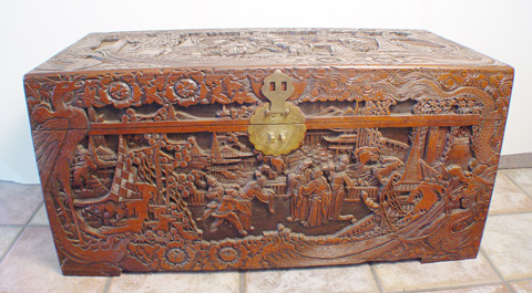 CHINESE CARVED CAMPHOR CHEST: Deeply carved on five sides, lift top storage chest. 19''h. x 40'' x 20''.