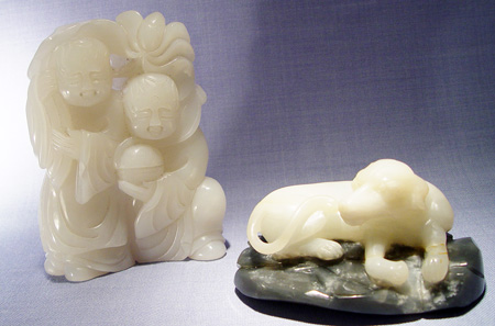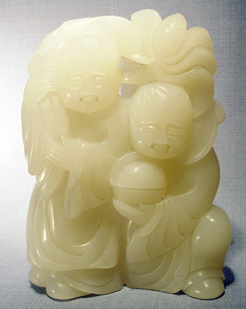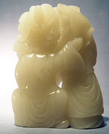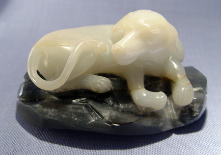 2 PIECE NORTHERN CHINESE CARVED WHITE JADE: Dog, 2''h. x 4''. x 3''. Two figures, 5 1/2''h. x 4''.