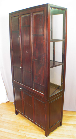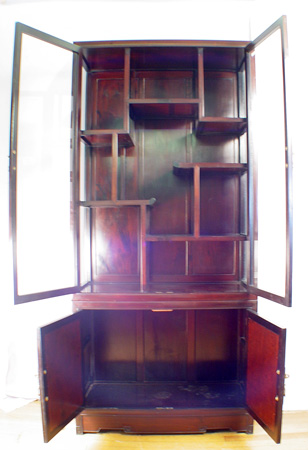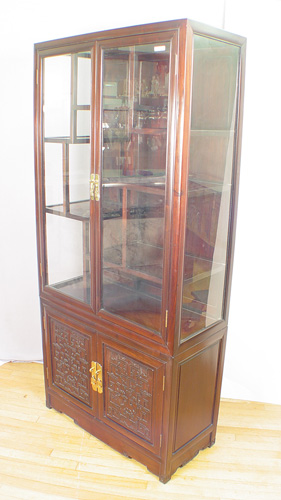 ORIENTAL TWO DOOR CURIO DISPLAY CABINET: Two glass doors over carved doors, 60''h. x 33'' x 15''.