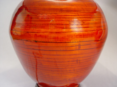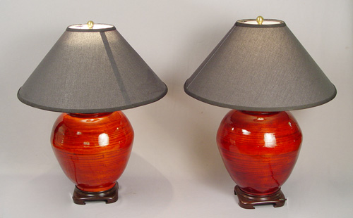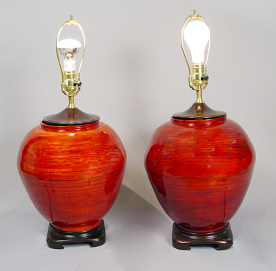 PAIR OF BANDED WOOD TABLE LAMPS: Appear to strips of wrapped wood, stained and lacquered. Black shades included. 25''h. overall.