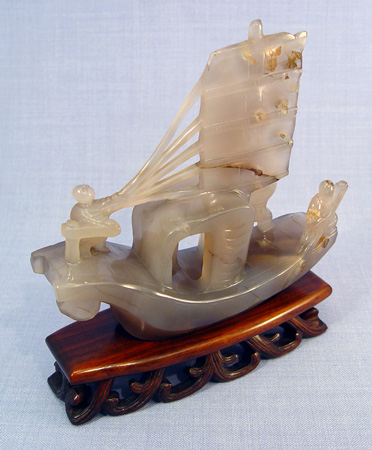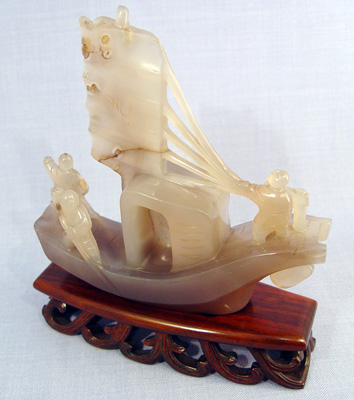 CARVED LAVENDER JADE SHIP: 6 1/2'' h., 7 1/2'' l. The custom wood stand adds an additional 1 1/2'' .