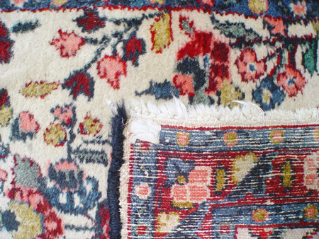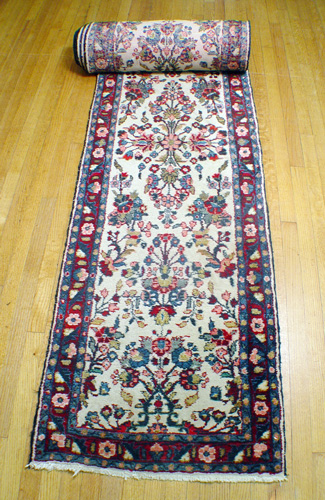 25 FT LONG HAMADAN CARPET RUNNER: Approx. 25'' l x 2' 3 1/2''. Blue and cream coloration.