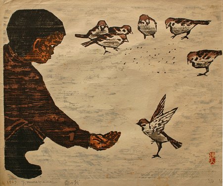 Y. MURAKAME FEEDING THE BIRDS WOODBLOCK: 15 1/2'' x 18 1/2'', signed and dated 1963, numbered 1/50, unframed. Light soiling in areas, some paper loss in the margins from tape. Est. $200/400**