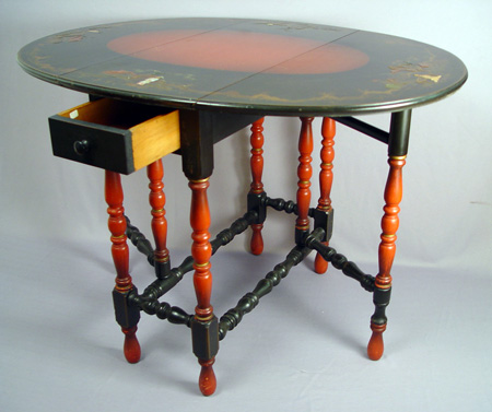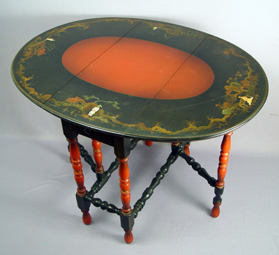 VINTAGE CHINOISERIE DECORATED DROP LEAF TABLE: 29'' h. x 32'' x 42'' with leaves extended, 13 1/4'' wide when leaves are closed.