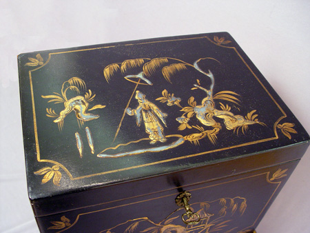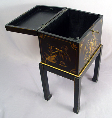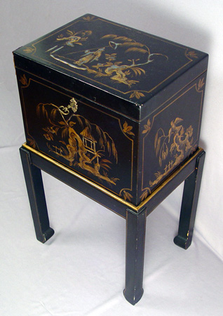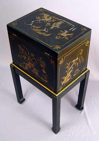 CHINESE BLACK LACQUER BOX ON STAND: 20th C storage box on stand, hand decorated. The box is 11'' x 15'' x 11''. On the stand it is 27''h.