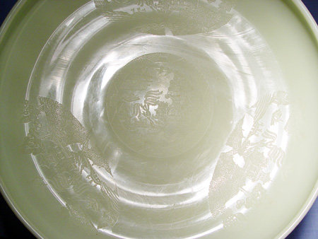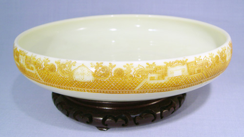 CHINESE ETCHED CUSTARD GLASS BOWL: Etched design along the edges, but note the subtle etching to the interior. 12 1/4'' dia., 3''h.