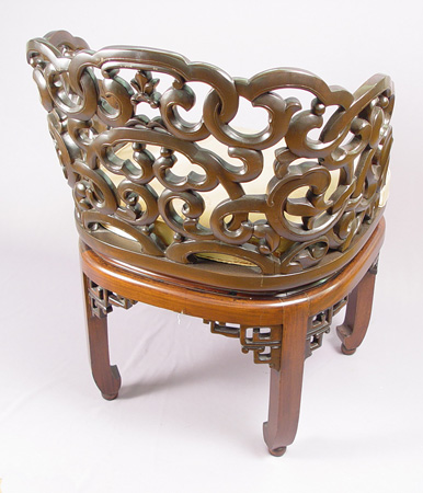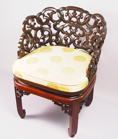 CARVED ORIENTAL PARLOR CHAIR: Fine pierce carved chair at hip rail height. Back curves around to the arms, traditional Chinese legs. Please note the upholstered seat will need to be redone. 30''h. x 23'' x 23''.