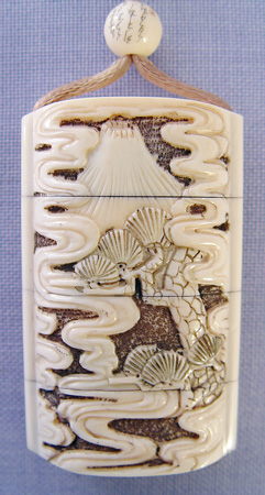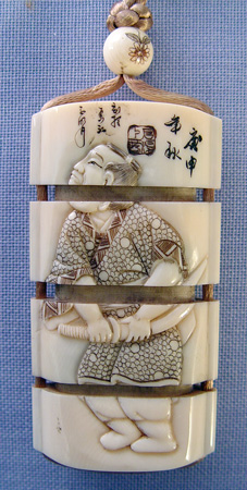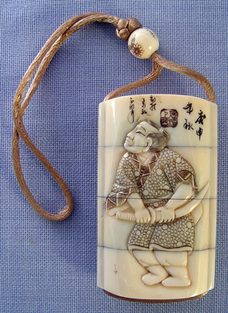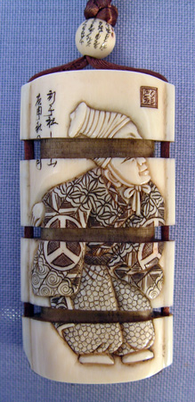 4 SECTION CARVED IVORY INRO AND OJIME: Warrior with sword on one side, running water on the other. The warrior side of the inro and the ojime have character writing. 2 3/4'' X 1 3/4''