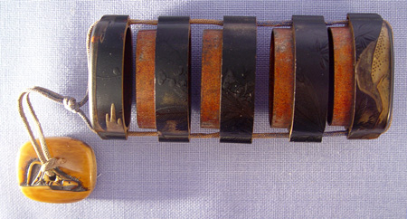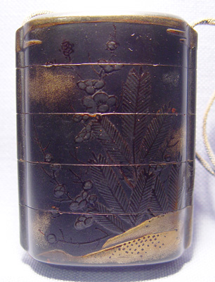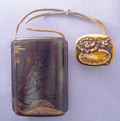 JAPANESE LACQUER INRO WITH IVORY NETSUKE: 5 sections with gold accented floral design, carved netsuke is 1 1/3''l. Inro is 2 3/4'' X 2''. No chips or breaks to the lacquer.