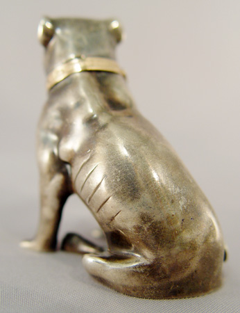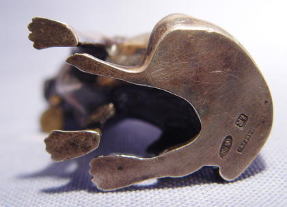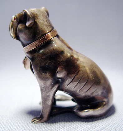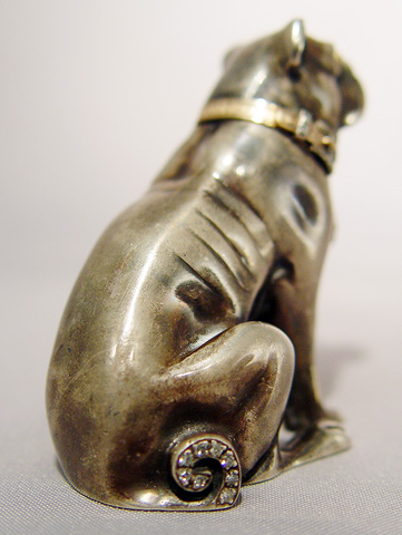 FABERGE SILVER BULL DOG: Silver body with gold collar set with diamonds and a ruby tag, ruby eyes and more diamonds decorate the tail, Faberge mark to bottom, 88 zolotnik = 916.6/1000, Moscow 1908-1917, maker Julius Alexandrovich Rappoport, 2 1/4'' h., 230 grams.