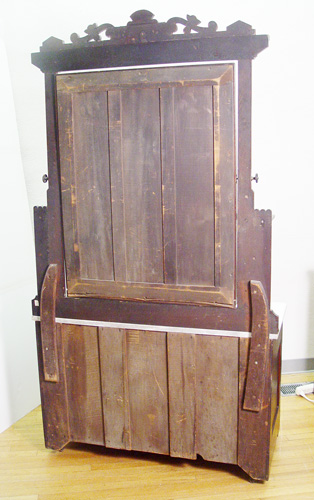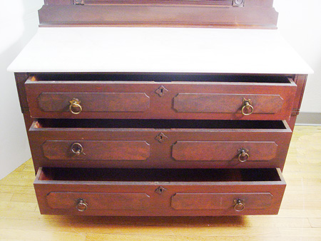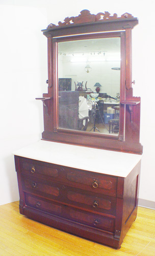 EASTLAKE VICTORIAN MARBLE TOP DRESSER WITH MIRROR: White marble top (discolored) over three full length drawers. The drawers have applied panels and original pulls. Overall height with mirror is 6'10'', 46'' w. x 21'' d.