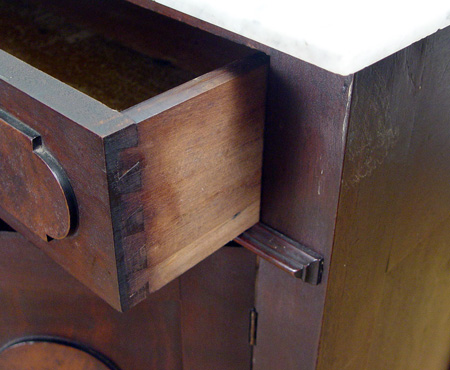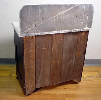 VICTORIAN MARBLE TOP WASHSTAND: Mahogany cabinet, white marble top with high backsplash and candle shelves, 2 drawers over double doors, 39'' h. x 30'' x 17''