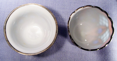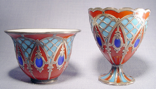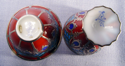 2 SEVRES SILVER OVERLAY CUPS: An egg cup and a handleless coffee cup. Blue mark over glaze. Please note slightly visible hairline on the interior of each piece. 2 1/4'' and 1 1/2''h.