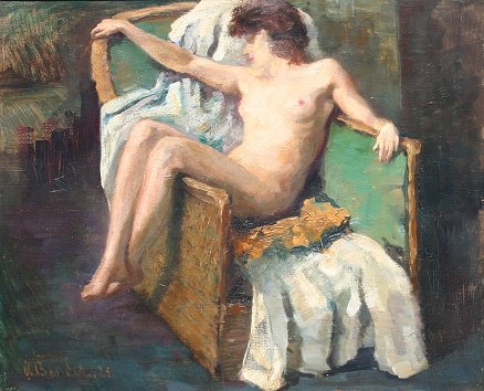 BENDA, Wladyslaw, (American, 1873-1948): ''Reclining Nude'', Oil/C, 17 1/2'' x 21 1/2'', signed and dated '25, worn frame, 21'' x 25''. Mild cracklure and scattered very minor paint fleck. Est. $1500/2500**