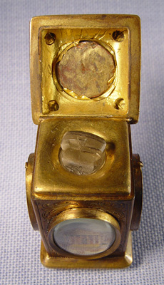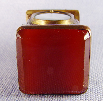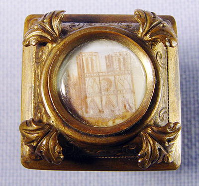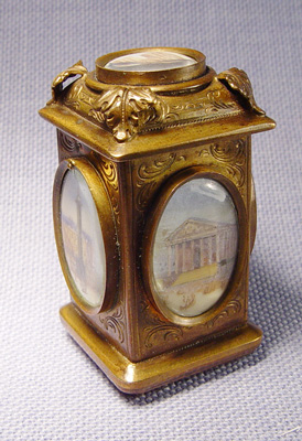 BRASS & GLASS SCENT BOTTLE WITH MINIATURE PAINTINGS: Tiny glass bottle totally enclosed in brass? with carnelian bottom, leaf accents and five miniature paintings. Images depict landmarks from around the world, 1 3/4''h. overall.