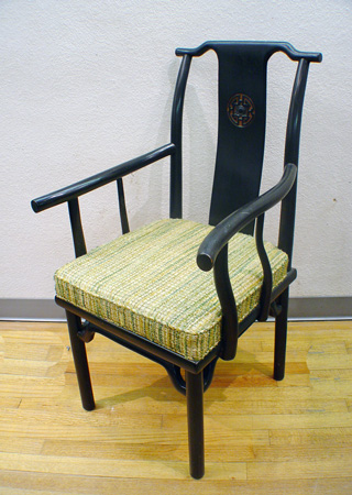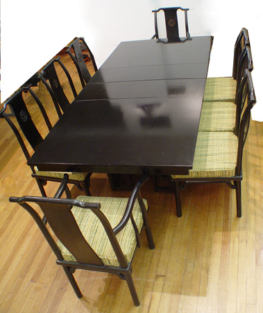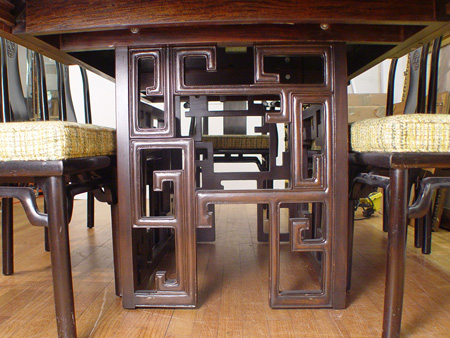 ORIENTAL DESIGN TABLE WITH 8 CHAIRS: Pierced double pedestal. Table with leaves in place is x 29 1/2'' h. 84 3/4'' l. x 40''., without leaves it is 60''l. Yoke chairs are 38'' tall x 18'' x 21''.