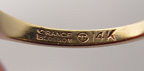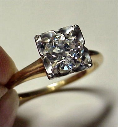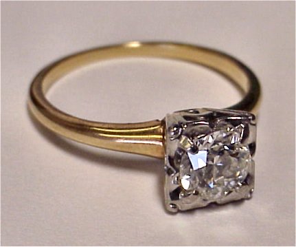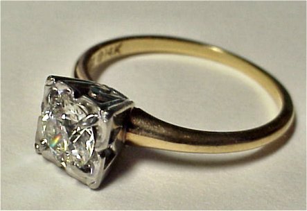 3/4CT DIAMOND SOLITAIRE RING: Round brilliant cut diamond measures approx. 5.8 x 5.8 x 3.5, set in square mount of white gold on a yellow gold band, marked Orange Blossom 14k, size 7.25, 2.5 grams.