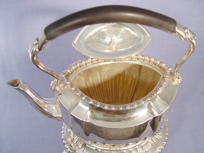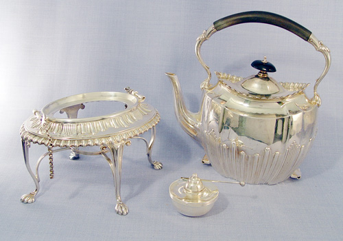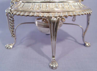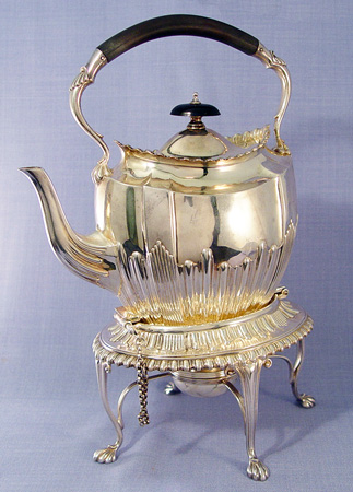 SHEFFIELD SILVERPLATE KETTLE ON STAND: James Dixon & Sons. English registry dates this to 1895. Kettle with ebony wood handle, the stand is raised on long cabriole legs ending in paw feet. Pins on chains hold the kettle in place. Warmer included. 13''h.