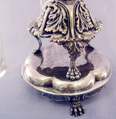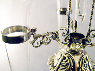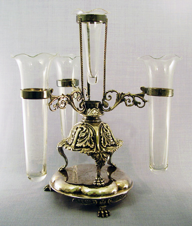 WALKER & HALL 19th C SHEFFIELD SILVERPLATE EPERGNE: Three arms and center hold four glass trumpet vases, the center having a smaller vase. 13 1/2''h. 7'' dia. across the base.