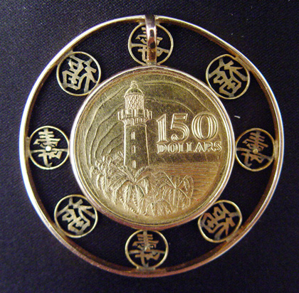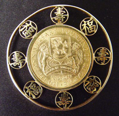 150 DOLLAR SINGAPORE ANNIVERSARY COIN PENDANT: 1969 coin bezel set in 18k yellow gold pendant with oriental symbols, 2'' dia. overall, 34.7 grams total.