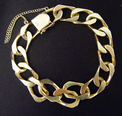 GENTLEMAN'S 14K CHAIN LINK BRACELET: Yellow gold large link bracelet, pressure clasp with safety latch and safety chain, approx. 7''l., 43 grams.