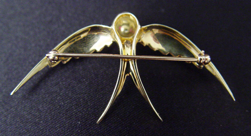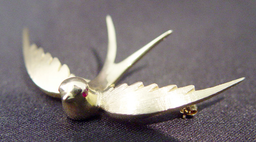 ADORABLE GOLD BIRD BROOCH: 18k yellow gold figural bird pin with polished body and textured wings, tiny ruby eyes, 2'' wing span, 6.4 grams.