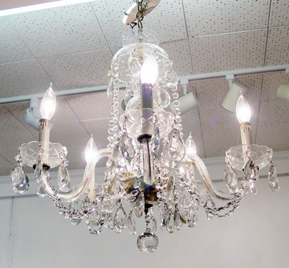 CRYSTAL CHANDELIER: 5 light, 5 arm with crystal chains and prisms. 21'' tall, excluding chain, 21'' dia.
