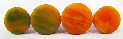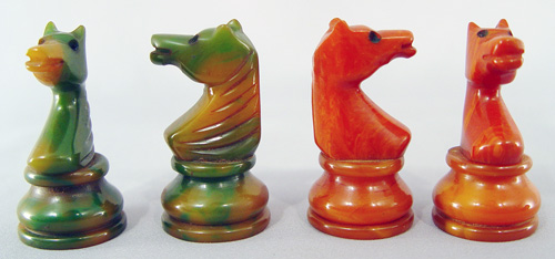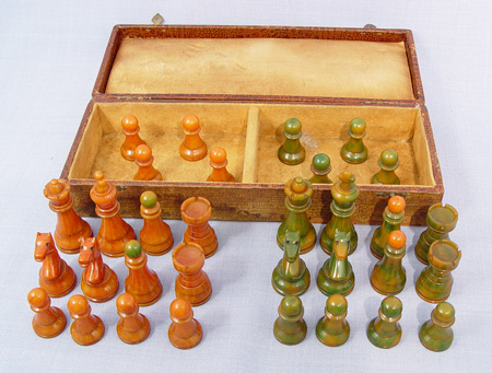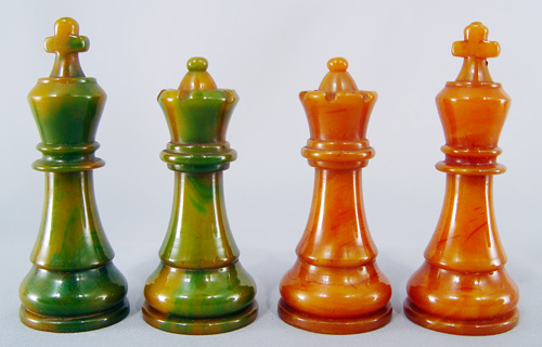VINTAGE BAKELITE CHESS SET: Green and amber, 32 pieces with the king being 3''h. Sold with the wooden storage box.