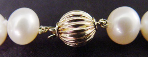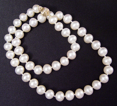 18'' STRAND OF 9-10MM PEARLS: Creamy white slightly off round and well matched, double knotted, 14k yellow gold ball clasp. Est. $250/400**