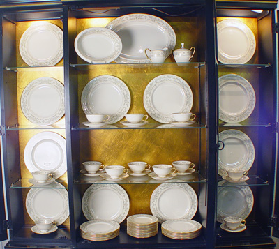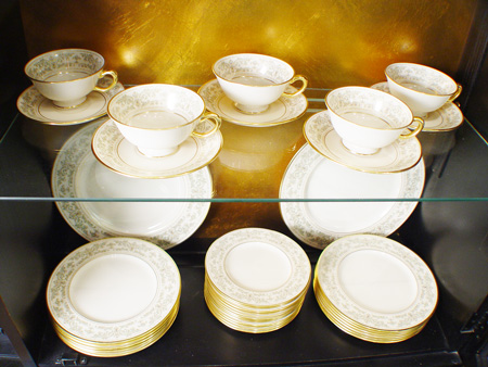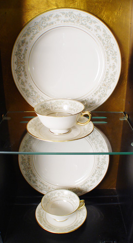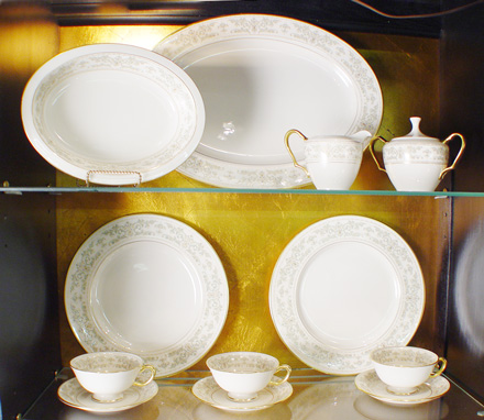 LENOX FINE CHINA SERVICE FOR 12 IN THE ''NOBLESSE'' PATTERN: 64 pieces to include 12 each of dinner plates (10 1/2''), salad plates, bread plates, cups and saucers. A 16'' platter, open vegetable bowl, cream pitcher and covered sugar.