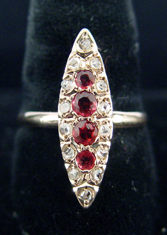ESTATE RUBY AND DIAMOND RING: Delicate yellow gold marquise shaped ring centered by a line of four rubies and edged with 14 tiny mine cut diamonds, acid tests 18k, 6.75, 1.5 grams.