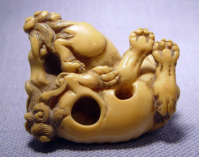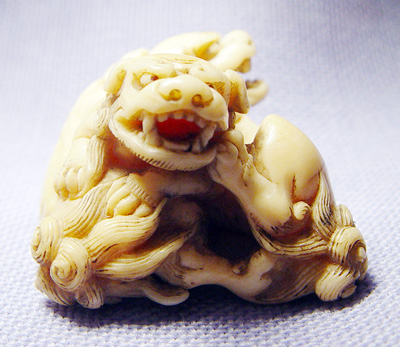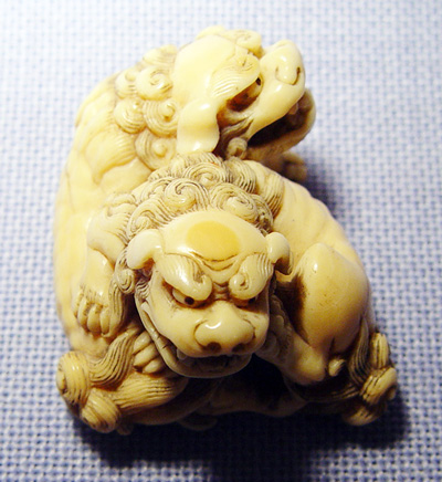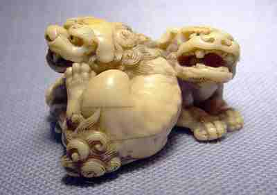 CARVED IVORY FOO LION NETSUKE: 2 Foo lions, entwined as one piece. 1'' tall x 1 1/4''. Some age separation.