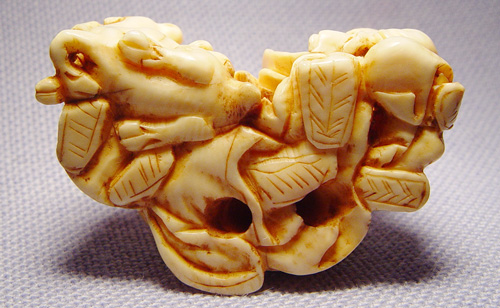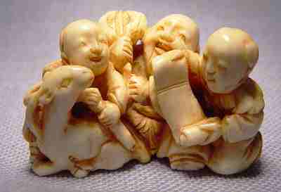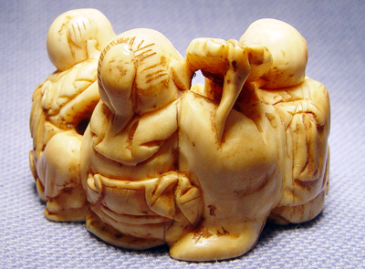CARVED IVORY NETSUKE GROUP OF MEN: Three men - one with scroll, one with musical instrument and one seated beside a deer, no signature noted, 1 5/8'' x 1'' x 1''.