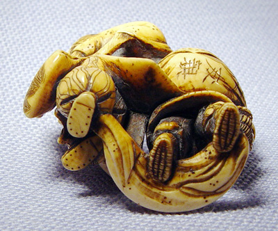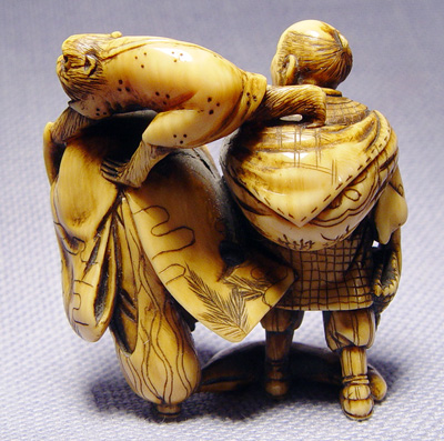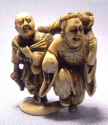 CARVED IVORY NETSUKE - 2 MEN WITH A MONKEY: Two men walking with ape climbing from one back to the other, signature on the bottom of one man's backpack I believe, 1 1/8'' x 1 3/8''.