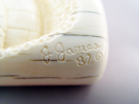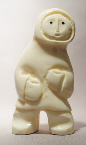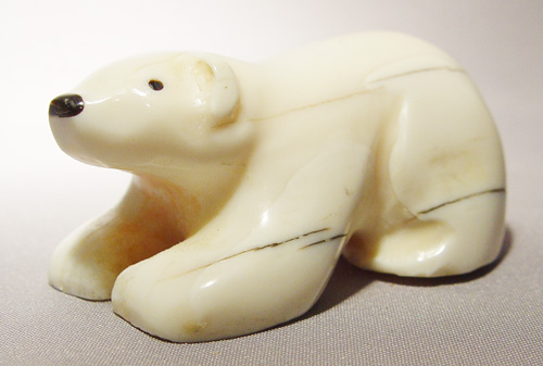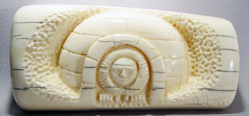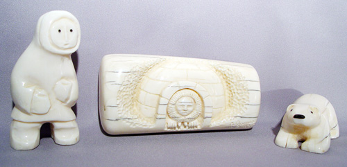 3 PIECE SIGNED CARVED ALASKAN INUIT IVORY: The two pieces signed Levi Tetpor are the Inuit man, 3 1/4''h, and the baby polar bear, 2 1/4''l. The piece with the igloo with peering face is signed J.James B20.