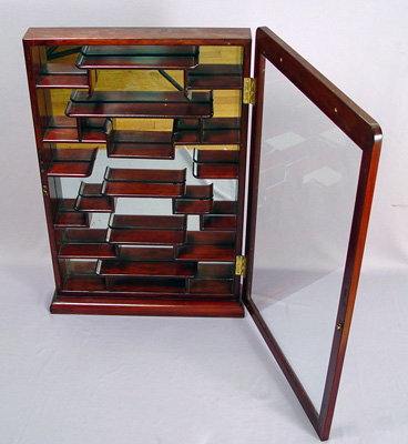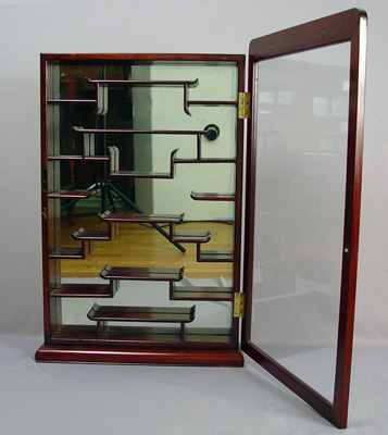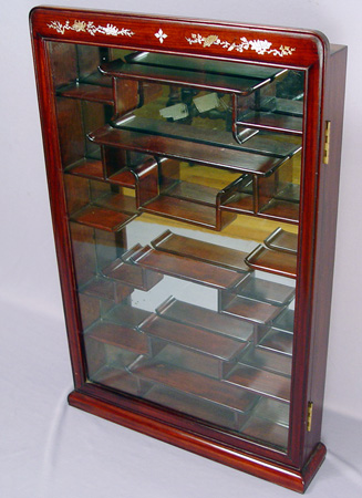 MOTHER OF PEARL INLAID NETSUKE DISPLAY CABINET: Wall mount or table top curio display cabinet. 32''h. x 20'' x 4''