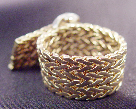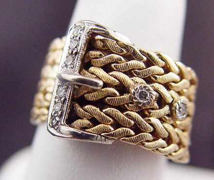 18K GOLD BUCKLE RING WITH DIAMONDS: Wide band appearing to be a mesh belt of yellow gold with a white gold buckle set with tiny diamonds and two more diamonds to the flap, gold content by acid test, size 6.5, 11.3 grams.