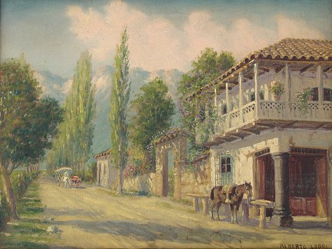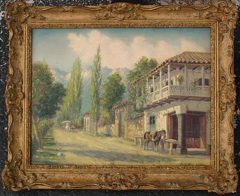 LOBOS, Alberto, (Chilean, 1892-1925): Chilean Village, O/C, 16 1/4'' x 21 1/4'', signed, encased in original pierce carved and gilded period frame, 21 1/4'' x 26 1/4''. Alberto Lobos and his brothers Enrique and Alfredo were all members of the ''Generation of Thirteen'' (meaning the year 1913), a bohemian group recognized as the best artists of their time in Chile, the very early 20th century. They were all students of the same mentor, one Maestro Fernando Alvarez de Sotomayor(1875-1960), a Spaniard imported to Chile by its government to lead the program at the Escuela de Bellas Artes de Chile. Each developed their own specialty, with Alberto Lobos favoring the wonderful landscapes of Chile. The works of Alberto Lobos (and his brothers) hang in virtually every major museum and private collection in Chile. The Museo Nacional de Bellas Artes owns works by all three. Biography thanks to AskArt and Bill Glover.