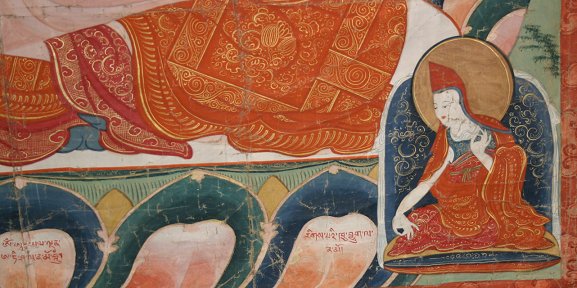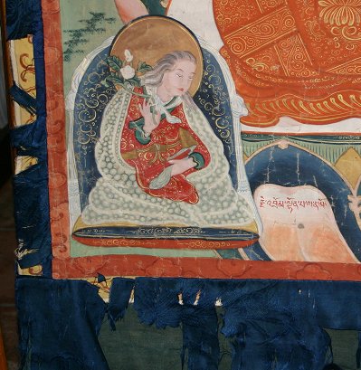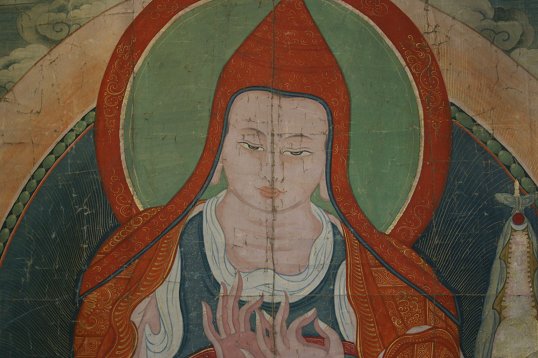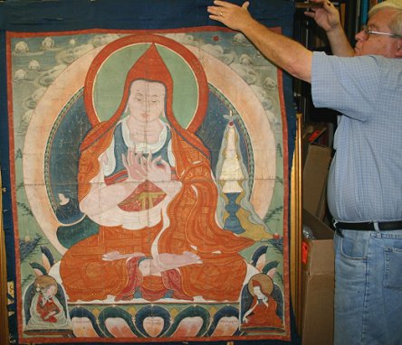 TIBETAN THANGKA: Age unknown, 48'' x 44'', worn condition with missing paint, inscription in the bottom margin. Christie's letter indicating that the thangka depicts Atisha. There is damage to the silk surround, which is definitely later than the canvas.
