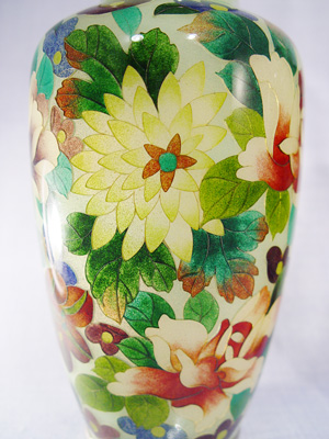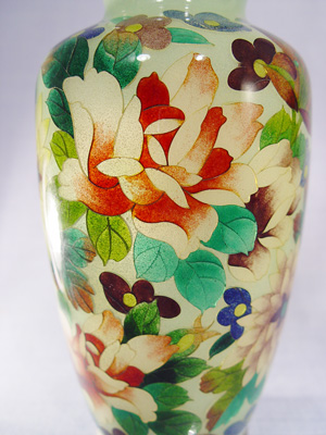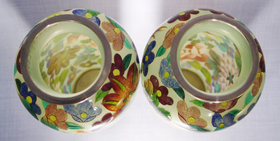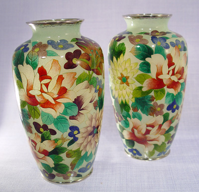 PAIR OF PLIQUE AU JOUR CLOISONNE VASES: All over floral design on pastel green ground. 7''h., 4'' dia. at the widest.