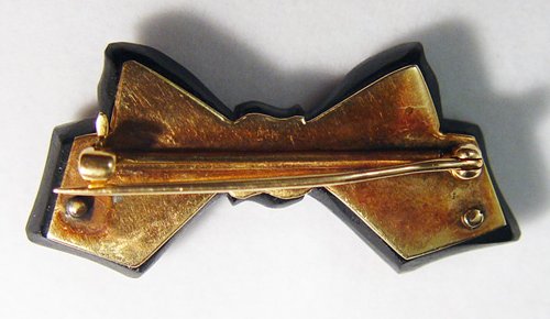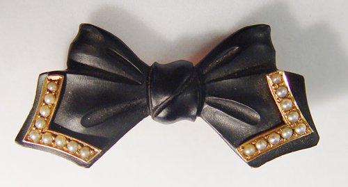 BLACK SATIN GLASS, GOLD & PEARL BOW PIN: Lovely little brooch in the shape of bow with yellow gold and seed pearl decoration to the loose ends, full gold backing and bar pin, marked 14k, 1 3/4'', 9.2 grams.