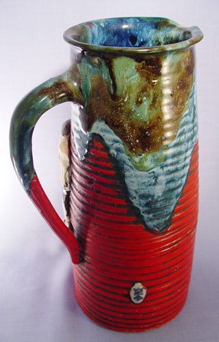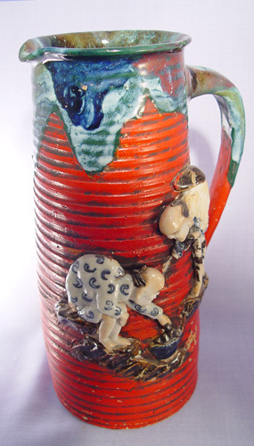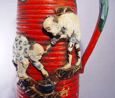 SUMIDA GAWA JAPANESE EARTHENWARE TALL PITCHER: Decorated with two figures, signed on cartouch in blue underglaze. 12 1/2'' h.